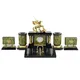 Корпус часов выполнен из латуни, подчеркнутой сложным золотым декором, а основание украшено сверкающим малахитом, придающим изделию глубину и благородство. Малахит, произведенный в легендарном месторождении Конго, добавляет этому произведению искусства неповторимый шарм. Размеры часов – 165 мм (длина) x 65 мм (ширина) x 375 мм (высота).
